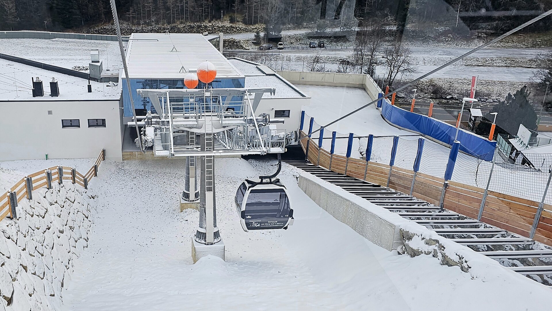 Die Talstation in ihrer finalen Form davor die neue Fußgängerbrücke über die Trisanna. Die Wegeführung, Bushaltestelle und Parkflächen sind fertiggestellt und für den Winter vorbereitet.