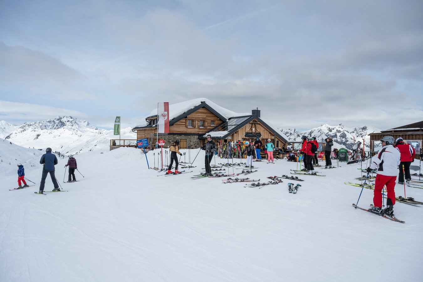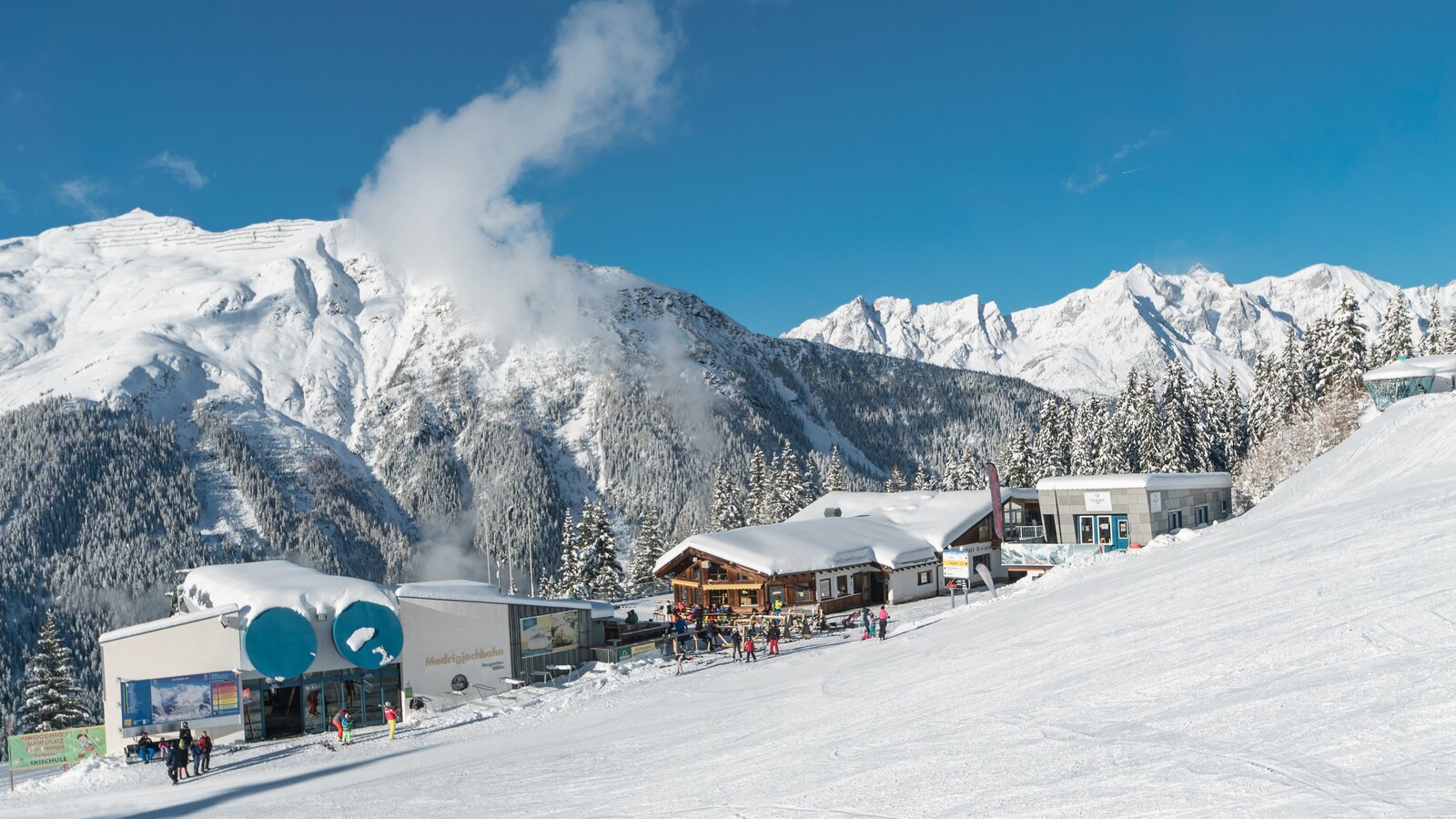Take the Medrigjochbahn from See to the Panoramarestaurant at 1,800 m. The self-service restaurant serves traditional hut classics, which you can enjoy on the large sun terrace with views of the Verwall group and the Hoher Riffler (3,168 m). The upstairs Panolounge features a deckchair terrace for relaxation. In winter, Medrigalm is the heart of the See ski area, while in summer, it is the starting point for numerous hikes, from leisurely walks through lush meadows and streams to climbing impressive three-thousand-meter peaks.