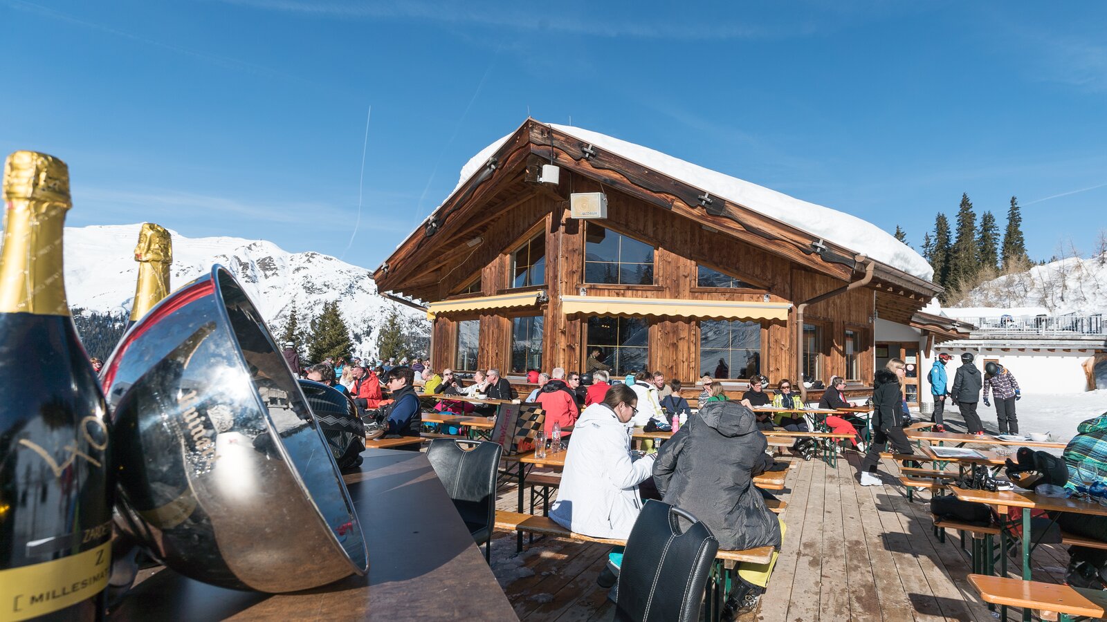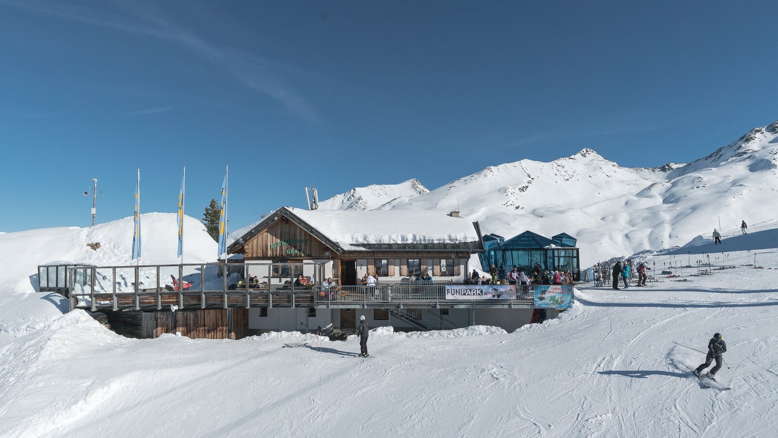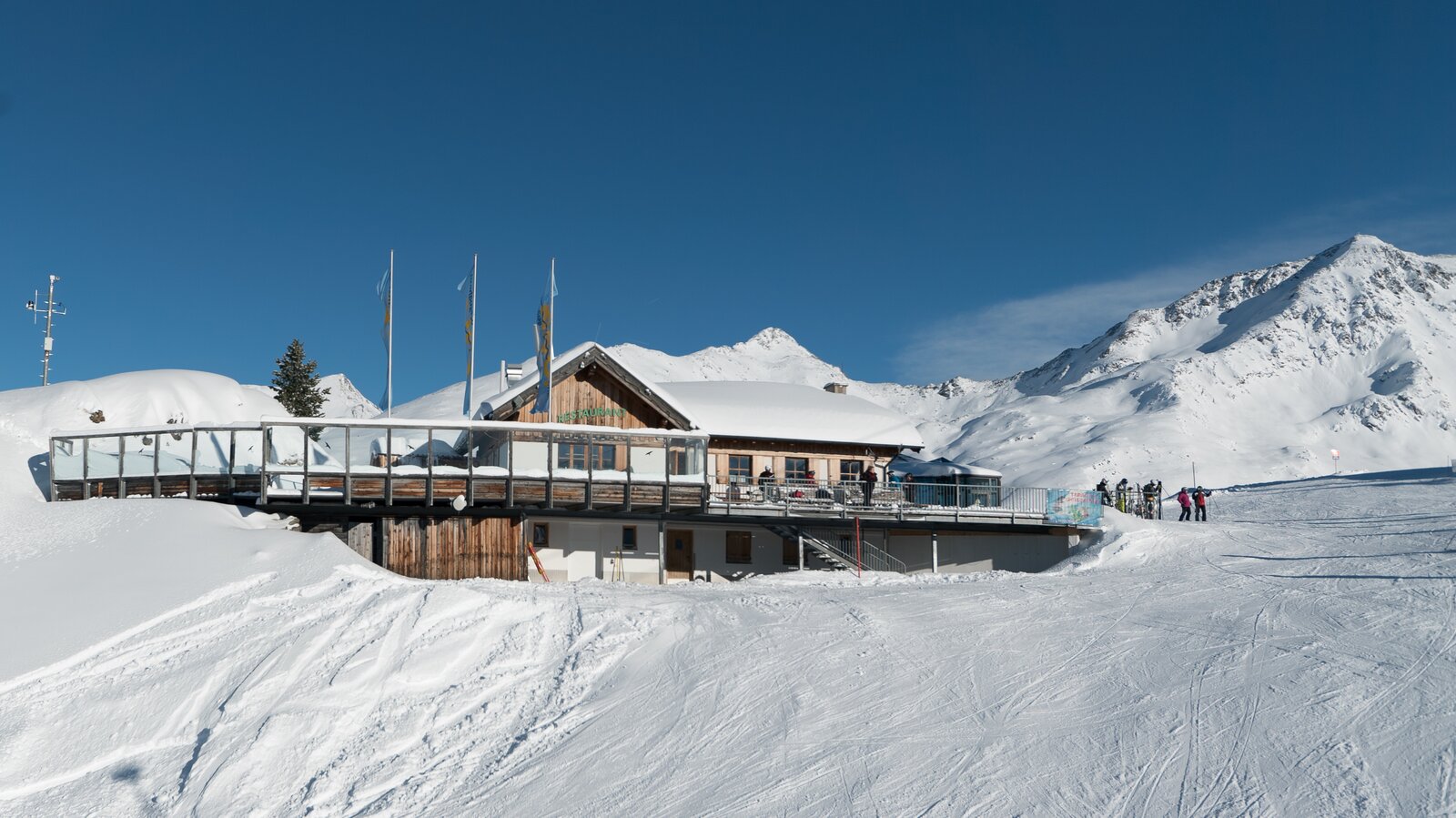 Romantically nestled in the snow-covered ski area of See, the Gratli Restaurant is located at 2,220 meters. The friendly staff eagerly awaits your visit. On the wind-sheltered sun terrace, warm Germknödel with vanilla sauce or Tiroler Bauerngröstl taste even better. Stay until the evening to experience a spectacular sunset while relaxing in a deck chair and letting your worries melt away. A visit to Gratli promises an unforgettable experience amidst the snowy mountain landscape.